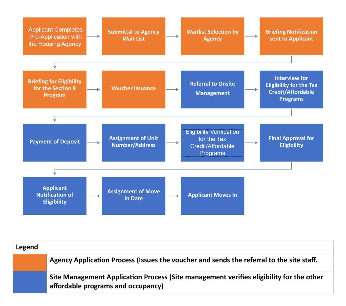 The application for occupancy at MH Homes can be confusing for applicants since it is administered by two different groups. It is actually a two-step process for applicants working with both the agency and the on-site management staff to complete the admission process. This process can best be illustrated below: